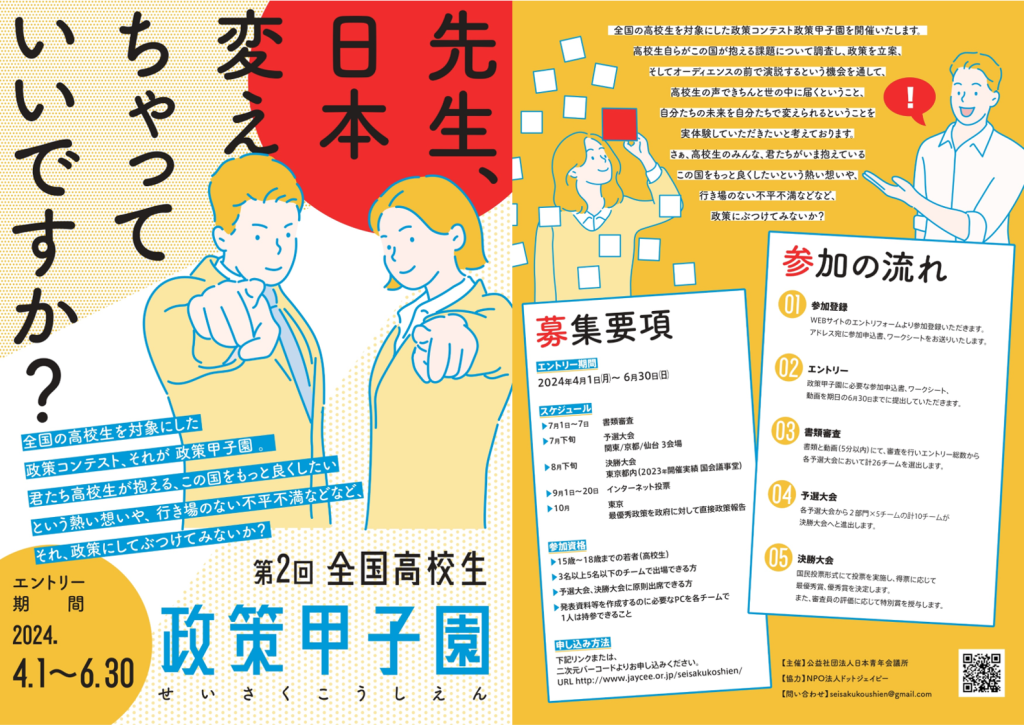 エントリーは政策甲子園の公式ホームページからお願いします。■https://www.jaycee.or.jp/2024/seisakukoshien/