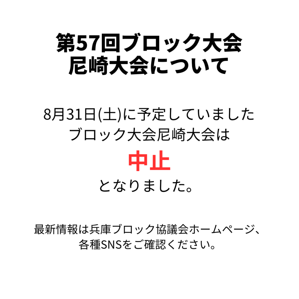 8月31日(土)に開催を予定しておりました「第57回ブロック大会尼崎大会」ですが、大型の台風10号接近が予測されており、安全な運営が難しいとの判断により、やむなく開催を中止させていただくことになりました。