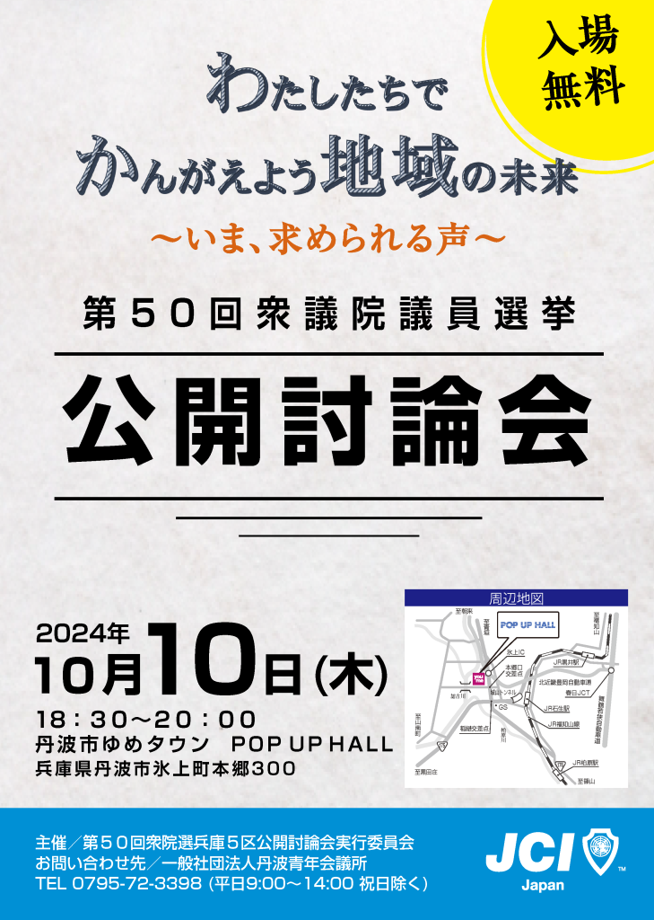 10月10日(木)18時半~20時にて丹波市ゆめタウンPOP UP HALLで衆議院選挙公開討論会を開催されます。