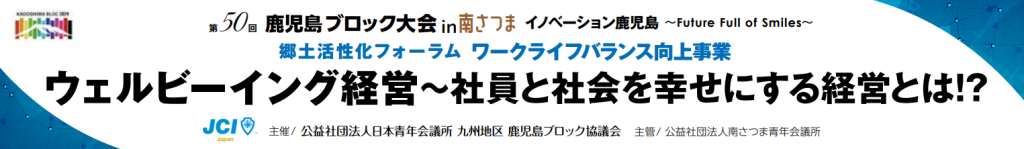 南さつま市総合保健福祉センターふれあいかせだにて「第50回鹿児島ブロック大会in南さつま」を開催します。大会テーマ「イノベーション鹿児島」〜Future Full of Smiles〜のもと、地域経済活性化事業「サスラブバスツアー」、郷土活性化フォーラム「ワークライフバランス向上事業」をはじめ、地域の魅力が詰まった食ブース、ゲームcupなど一日中楽しめる大会となっています。セミナーや基調講演に興味がある方はもちろん、ご家族でのご来場も大歓迎ですので、お気軽にお越しください。