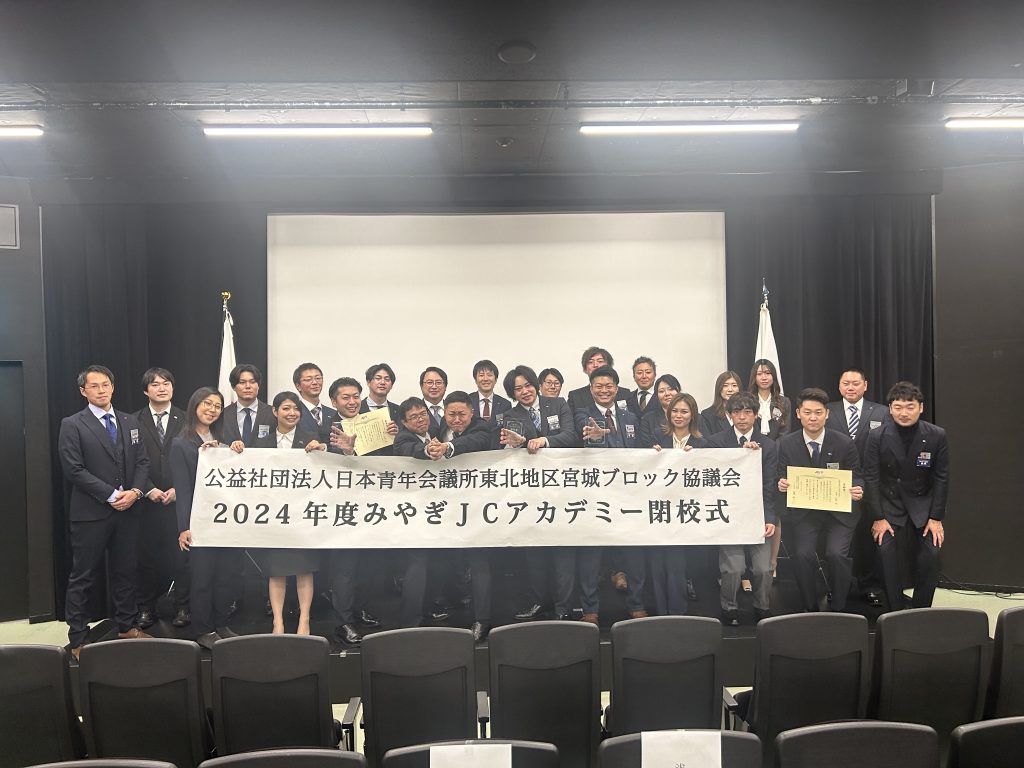 11/9(土)、2024年度みやぎJCアカデミー委員会閉校式が仙台メディアテークにて開催されました。この1年間の学びを発表する集大成の場となります。模擬議案の発表では、宮城県か抱える課題とその解決策を、参加したメンバーに分かりやすく伝えておりました。資料も非常に工夫されておりアカデミー生のこの日にかける想いが伝わりました。佐藤会長、高橋監査、吾妻監査から講評もいただき良かった点や、もっと工夫すべき点なども指摘され、アカデミー生は次年度以降の議案構築に活かせる場となったはずです。