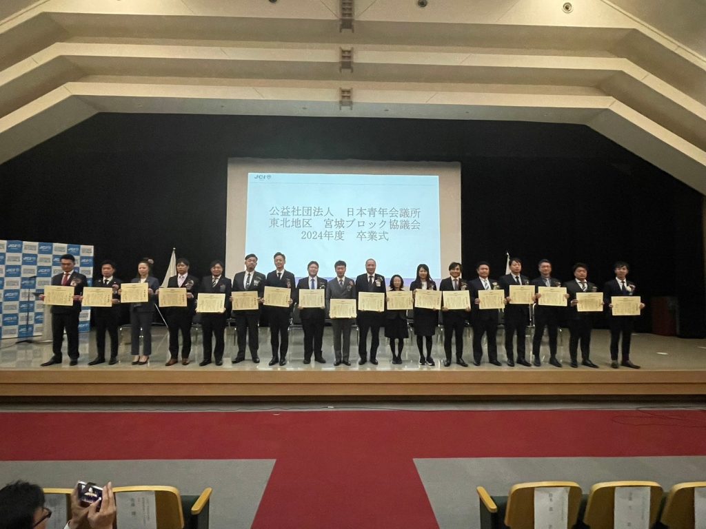 12/7(土)、公益社団法人日本青年会議所東北地区宮城ブロック協議会 2024年度卒業式並びに祝賀会を仙台の地で執り行いました。宮城ブロック役員を経験された卒業生は20名、当日は18名の卒業生にご出席いただきました。一人一人に佐藤会長より卒業証書が授与され、卒業生でもある佐藤会長には次年度会長予定である髙嶋啓佑君から卒業証書が授与されました。