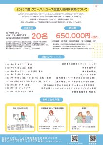 参加費: 650,000円(渡航費・研修中の交通費・宿泊費・研修費)