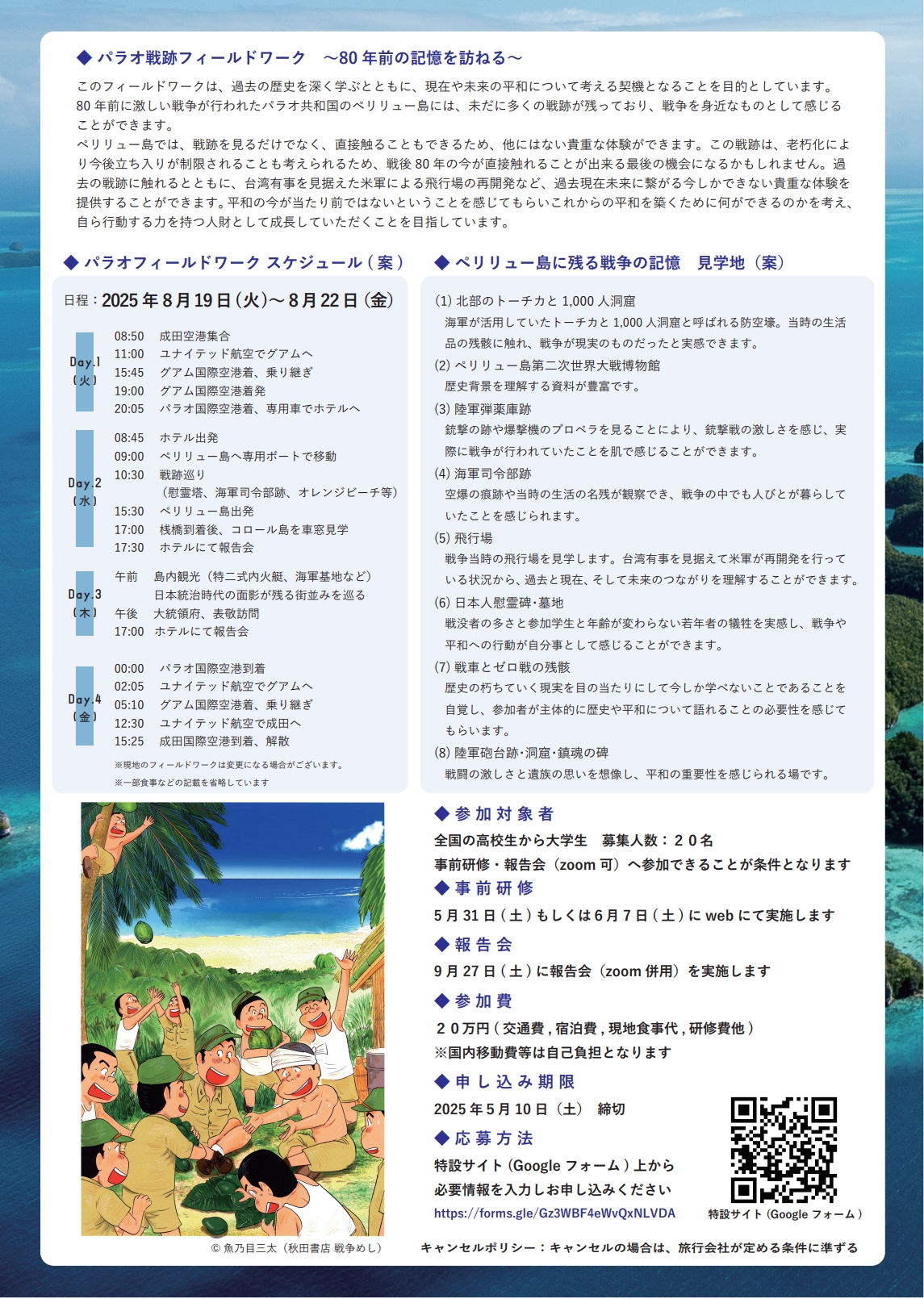 本事業では、過去の戦争の歴史を深く学ぶとともに、現在や未来の平和について考える契機となることを目的としています。80年前に第二次世界大戦の激戦地となったパラオ共和国のペリリュー島では、1万人以上の日本兵が命を落としました。島には未だに多くの戦跡が残されています。