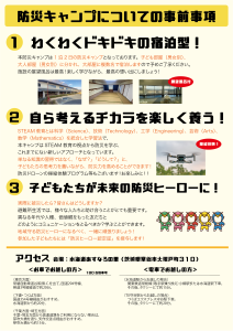 本キャンプは、最新の防災技術や知識を「体験」を通じて楽しく学べるプログラムで構成されており、STEAM教育の視点から子どもたちの“考える力”を育むことを目的としています。