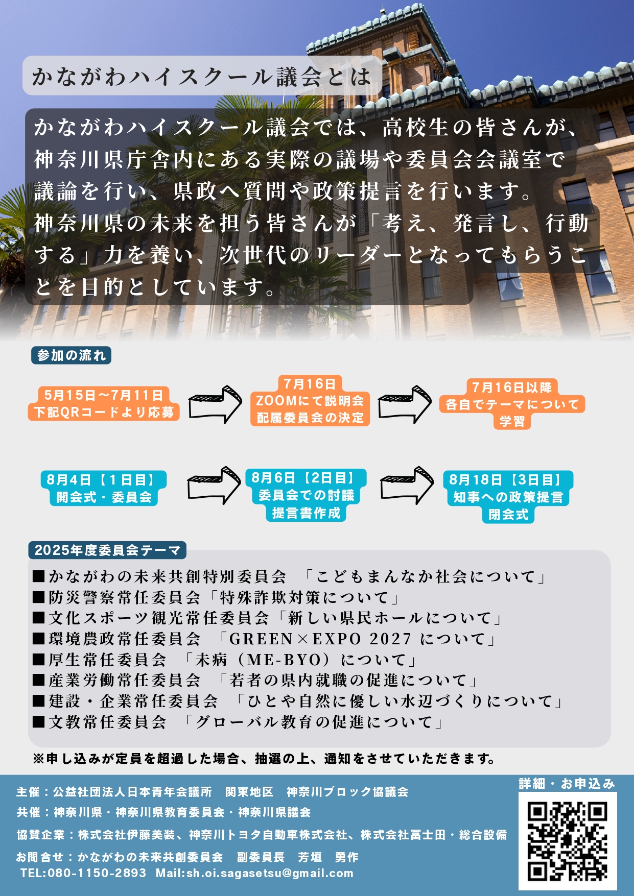 神奈川県内の高校生が集い、神奈川県の未来について主体的に議論する「かながわハイスクール議会2025」を本年度も開催します。