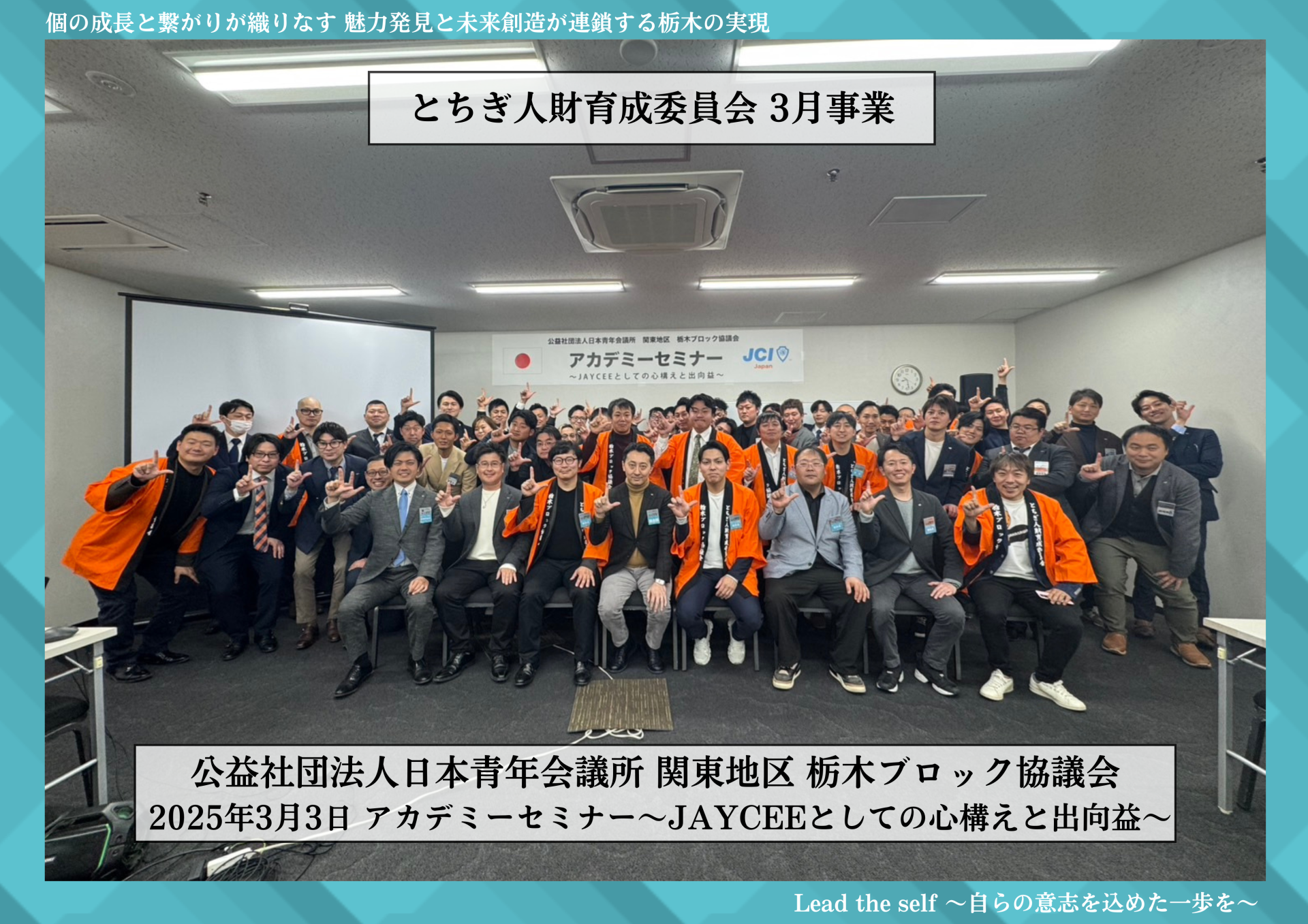 2025年3月3日(月)、TKP宇都宮カンファレンスセンターにて、とちぎ人財育成委員会主催「アカデミーセミナー ~JAYCEEとしての心構えと出向益~」を開催いたしました。