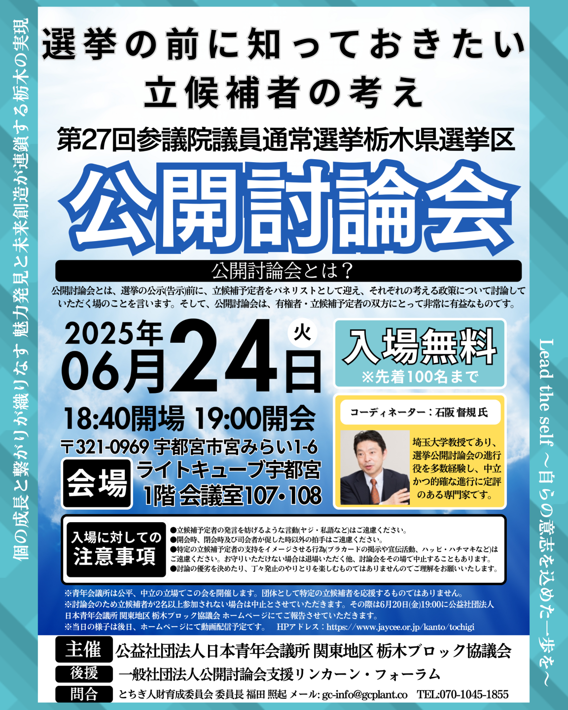 第27回参議院議員通常選挙 栃木県選挙区 公開討論会を開催いたします。