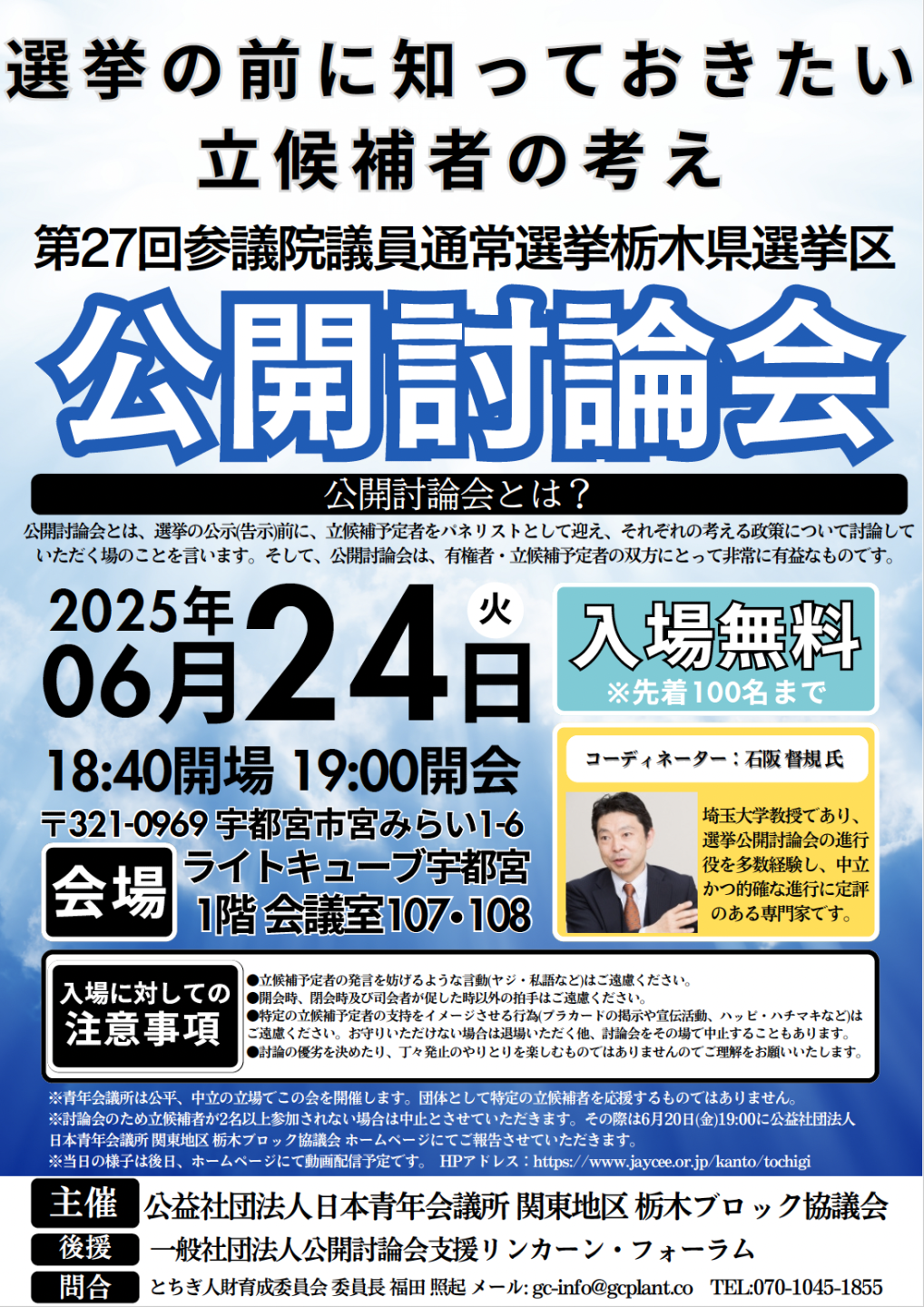 2025年6月24日(火)に開催いたしました「第27回参議院議員通常選挙 栃木県選挙区 公開討論会」の