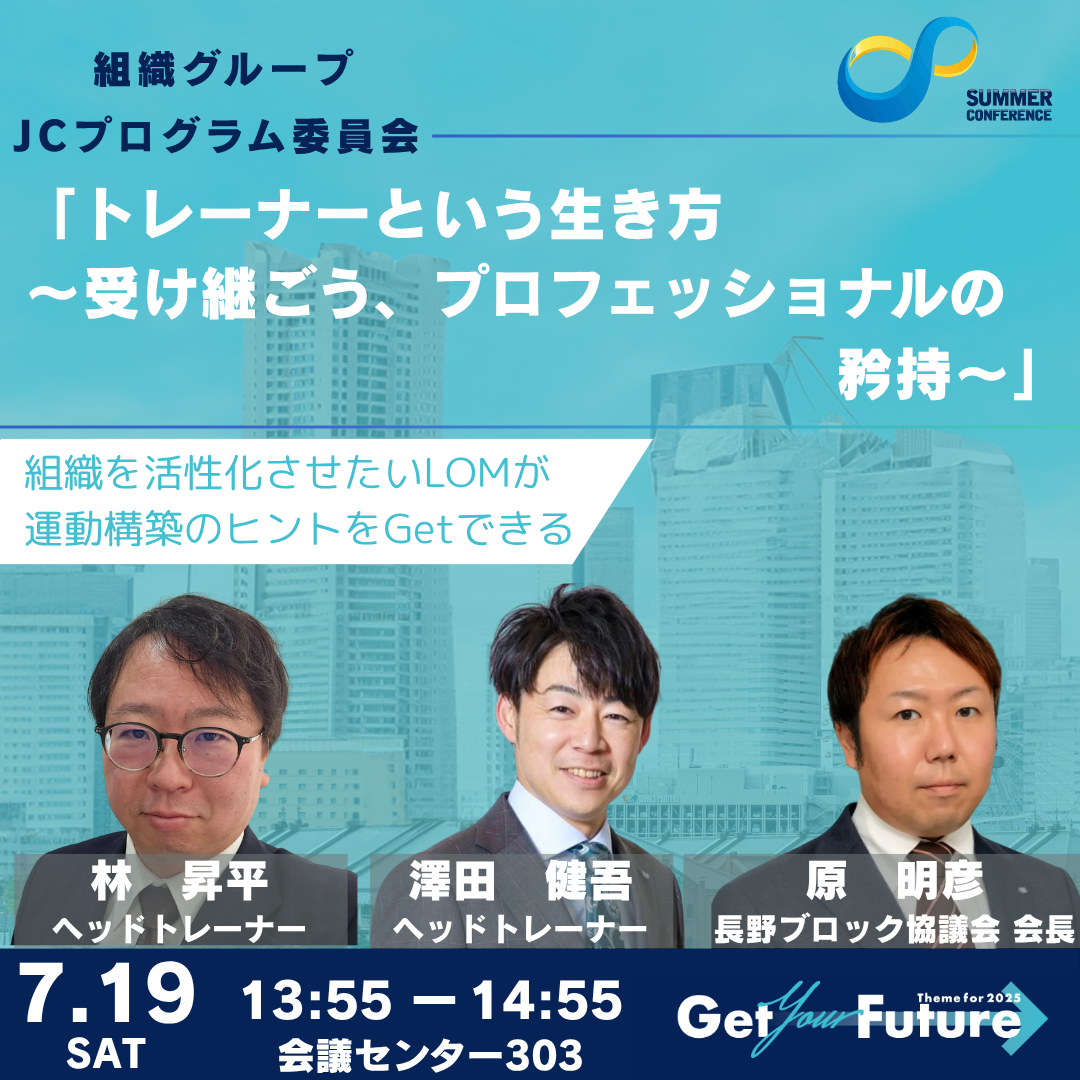 JCの理念や運動手法を体系的に学ぶことのできるJCプログラムと、その基盤となるトレーナーの減少は個々の能力開発の機会の減少や効果的な運動の発信力低下につながることが懸念されています。こうした状況に危機感を感じ、自らトレーナーを目指すことを選んだ長野ブロック協議会 原 明彦 会長と経験豊富なトレーナーによるパネルディスカッションを通じて、トレーナー制度の概要と現状について理解を深めます。“トレーナーとはどんな存在なのか”、“なぜトレーナーになるのか”、“トレーナーとして必要な事とは何か”といった問いから、トレーナーとしてあるべき姿、トレーナー発掘の近道を探るセミナーです!!
