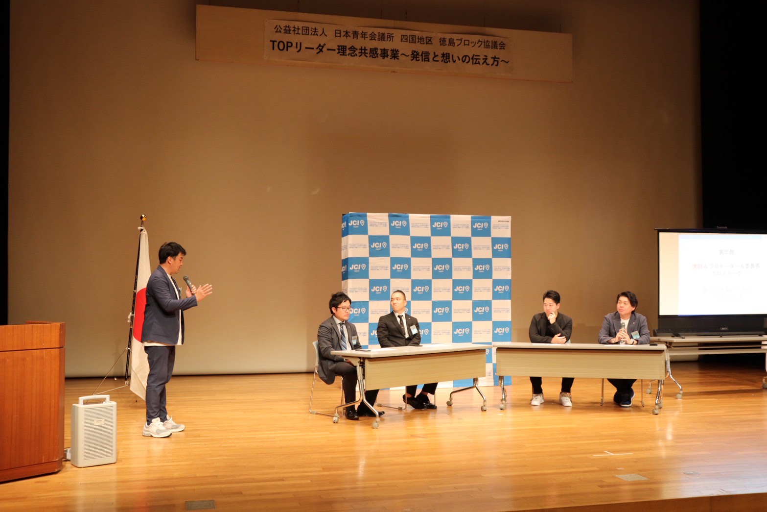 第3部では講師のお二人と理念共感プロモーターである阿波池田JCの梯君、そしてTOPリーダー育成委員会委員長の久米君を交えクロストークを行いました。そのファシリテーターとして副会長の澤田君、それぞれの意見や思いをうまくまとめていただき、聞いていて学びの多いクロストークとなりました。