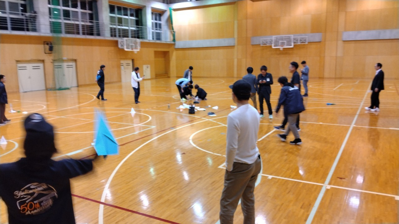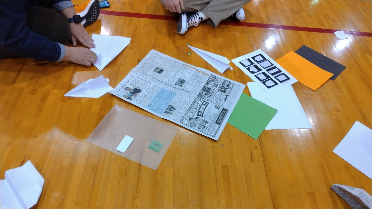 「神ヒコーキコンテスト」ということで、文字通り神なる紙飛行機をグループで相談し、飛距離と滞空時間を競い合うものでした。