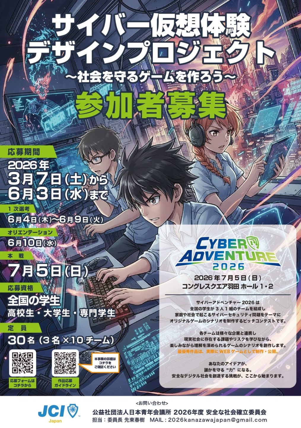 サイバー攻撃や情報操作のリスクは、SNSやネット決済など、日常の身近なところに潜んでいます。日本JCでは、こうしたリスクへの理解を深めるため、体験的に学べる謎解き型ゲームの企画案を全国の高校生から募り、ピッチコンテストを開催します。