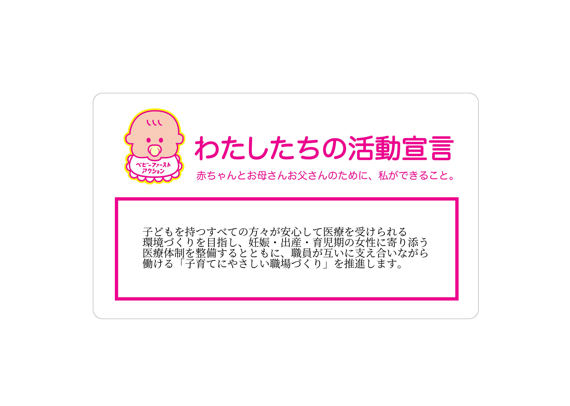 企業・個人 S.T styleクリニック 2025.11.14 活動宣言 子どもを持つすべての方々が安心して医療を受けられる環境づくりを目指し、妊娠・出産・育児期の女性に寄り添う医療体制を整備するとともに、職員が互いに支え合いながら働ける「子育てにやさしい職場づくり」を推進します。 アクションプラン ACTION01 育児と仕事の両立を支援する勤務体制を整備し、子育て世代の職員がキャリアを継続できる職場環境を推進します。 企業HPへ Tweet Share Hatena Pocket RSS feedly Pin it