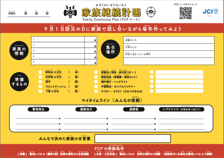 レジリエンス強化委員会では、家庭から防災、減災の意識を高めるため、BCPの家庭版であるFCP(Family Continuity Plan)を、ブロック協議会と連携しながら全国に普及してまいります。あわせて、FCPシートを各家庭で作成することにより、災害時においても家族の安全を確保し、安心かつ安定した生活を継続できるよう備えを促進します。これらの取組を通じて、家庭および地域のレジリエンスを高め、家庭から安全、安心、安定して暮らせる社会の実現に向けた仕組みを構築します。また、災害大国日本において、どこで災害が発生しても迅速に支援体制を構築できるよう、全国の防災担当者や社会福祉協議会と平時から連携、交流を行い、強固な災害支援ネットワークを構築します。