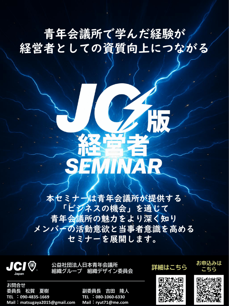 そして青年会議所が提供するビジネスの機会から学ぶ「JC版経営者セミナー」によって、青年会議所の魅力やメリットを知り、経営者・青年経済人としての知見を深めることに役立てます! 是非とも当委員会の支援ツールとなります2種類のセミナーを御活用いただきまして、LOM発展の一助となりましたら幸いです。