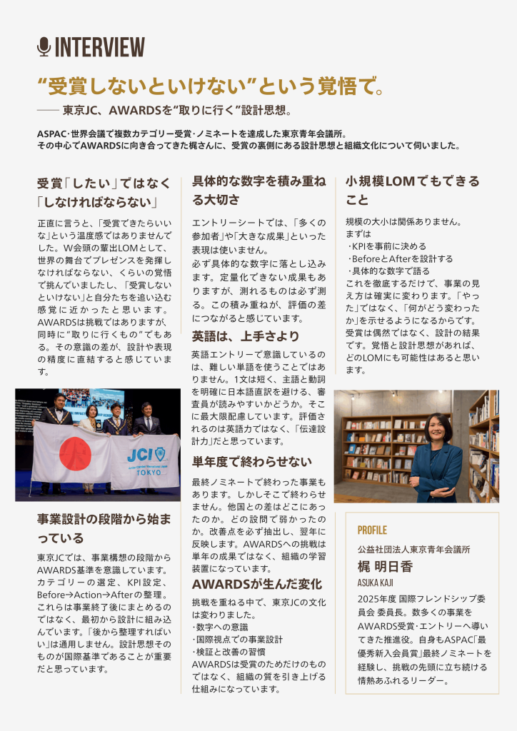 AWARDSを“挑戦”ではなく“取りに行くもの”と捉える東京JCの設計思想について、2025年度国際フレンドシップ委員会委員長 梶明日香氏に伺いました。