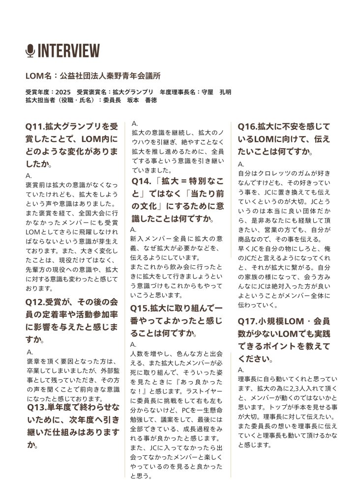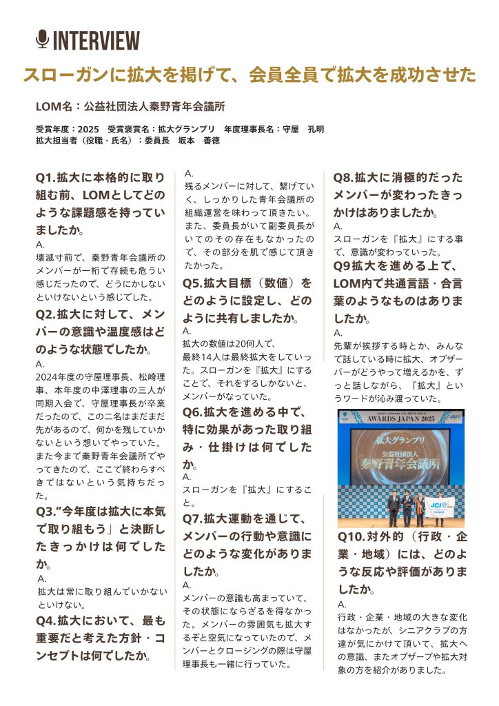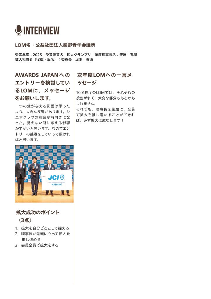 会員拡大 【2025年拡大グランプリ】スローガンに拡大を掲げて、会員全員で拡大を成功させた:公益社団法人秦野青年会議所 2026.02.24 この記事のタイトルとURLをコピーする Post Share Hatena Pocket RSS feedly Pin it