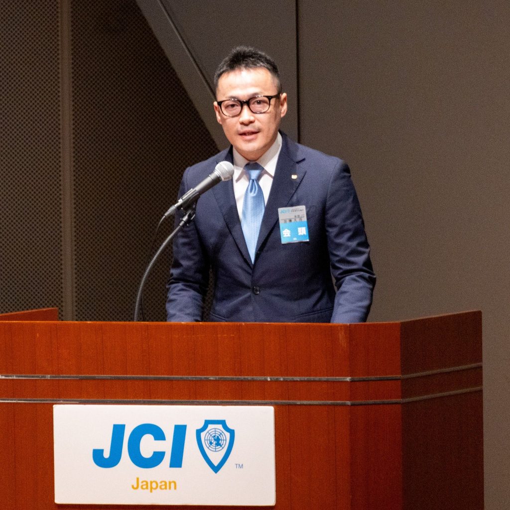続いて、2025年度の事業報告および決算の承認がされた際には、外口 真大 直前会頭より、2025年度のJC運動に対する感謝を述べるとともに、「一歩一歩の小さな変化の積み重ねこそが『明るい豊かな社会』への唯一の道である」と1年間を振り返りました。そして、本年度掲げた理想に向かって歩みを止めず、「変わったのではない、変えたのだと誇れる未来へ」ともに突き進んでほしいと、各地会員会議所理事長へ力強いエールを送りました。