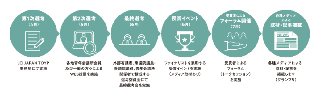 | 4月中旬 | :2次選考 ステージ1(JCの地区長、ブロック長、各ROMの理事長による投票) |