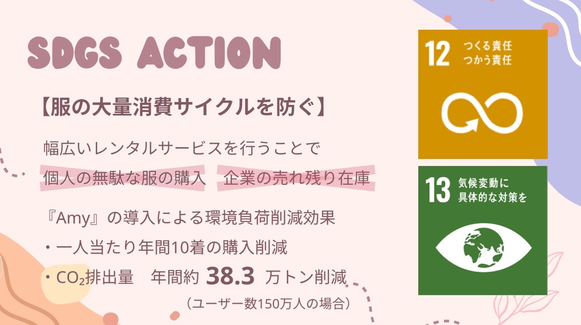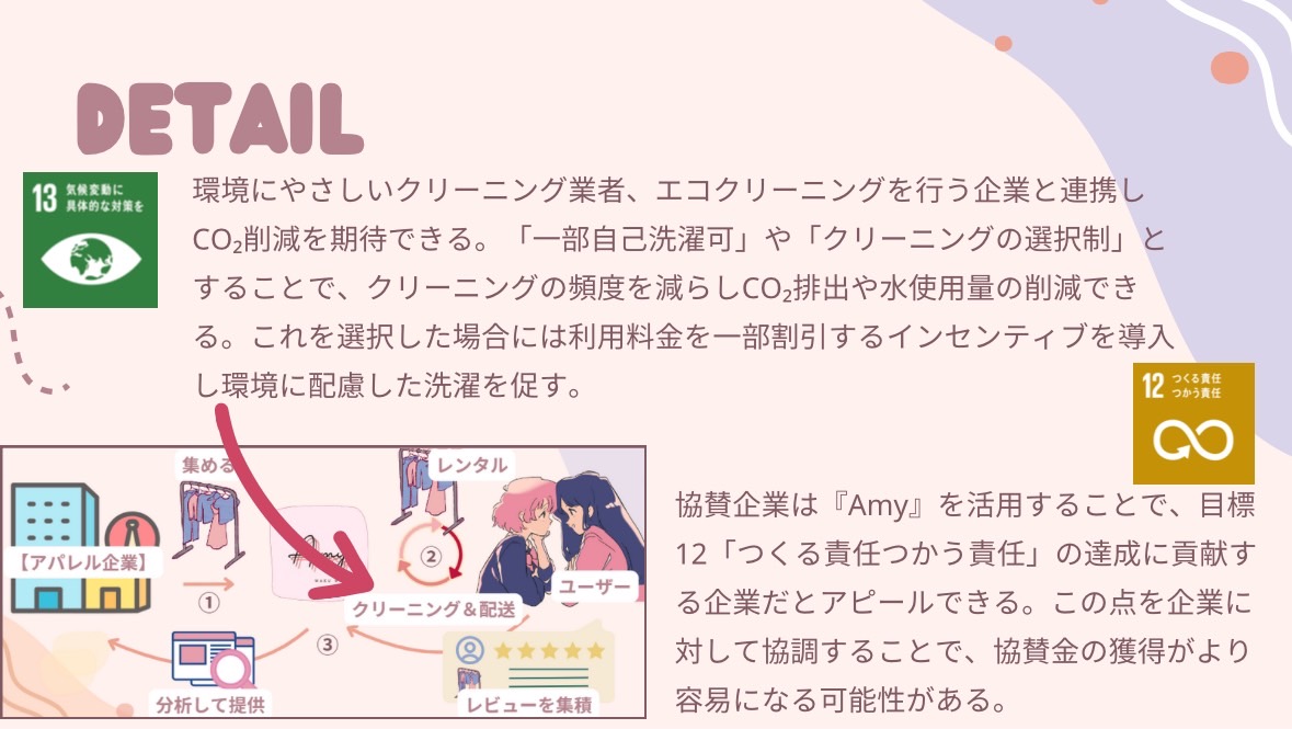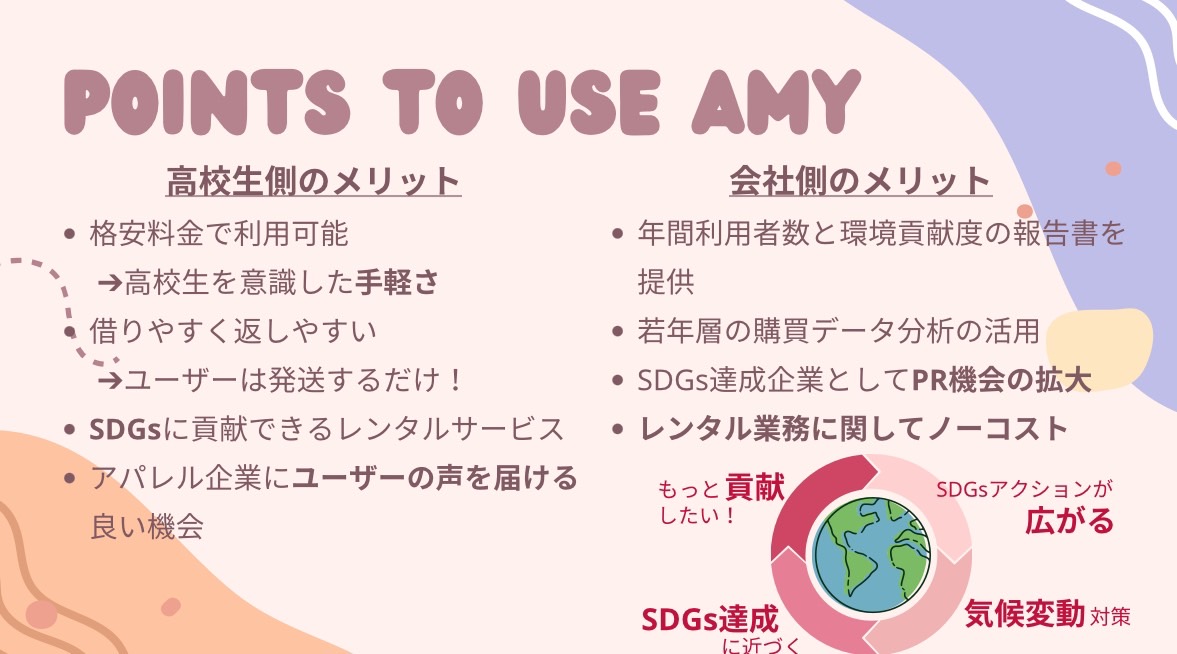 主な活動内容は高校生と企業の願いを同時に叶えるレンタル&モニターサービスとなっています。 服を「買う」から「借りる」への消費行動の転換を促進し、「消費者の声」と「企業のモノづくり」をつなぐ架け橋の存在となることを目指します。今の日本では生産されている服の約50%、約半分の服が廃棄処分されています。総量は約47000t、にもかかわらず今の日本の服のリサイクル率はたったの1%です。この状況を変えたいと思いました。しかしファストファッションによる大量生産、大量廃棄が当たり前になってしまっているこの社会を変えていくにはどこから変えていけばいいのか。私たち消費者にとっても企業にとってもwinwinであり、かつ社会にもとても良い影響を与えるにはどうしたらいいのか。それはプラスしか生まれない循環を産み出すことだと私は考えました。マイナスを最小限にしプラスを社会で生み出していく、これが今からの社会をよくしていくために必要になるのではないかと考えました。 私の考えたビジネスプランではその循環を可能にします。そのプランは「Amy」です。このプランでは服の大量廃棄サイクルを減らすことを実現します。 サービスの主な概要です。まずアパレル企業側から売れ残った服や廃棄予定の服を無償提供してもらいます。倉庫で商品を管理し、レンタルの注文が入るとユーザーの自宅まで発送します。一週間のレンタル期間で、商品のレビューをしてもらいます。そのレビューを私たちAmyが整理、分析しフィードバックをアパレル企業に還元します。このプランによってユーザーは安価でたくさんの服を楽しめ、企業は顧客情報をゲットし、よりよい服を作ることができるというwinwinのサイクルを回すことができます。そして同時に、服の大量廃棄を防ぎ、消費者の意識向上につながるという環境にも良い影響を与えることができます。この活動は日本全国で考えています。