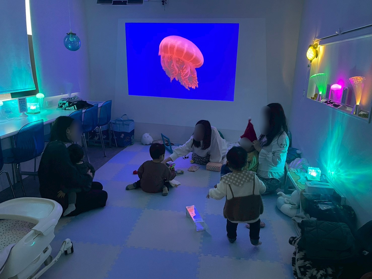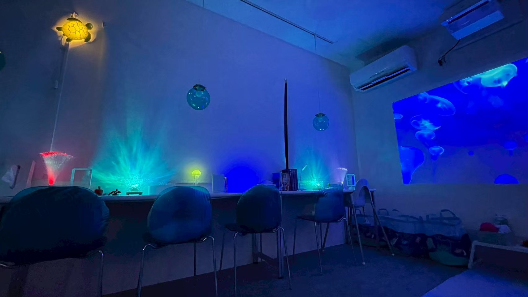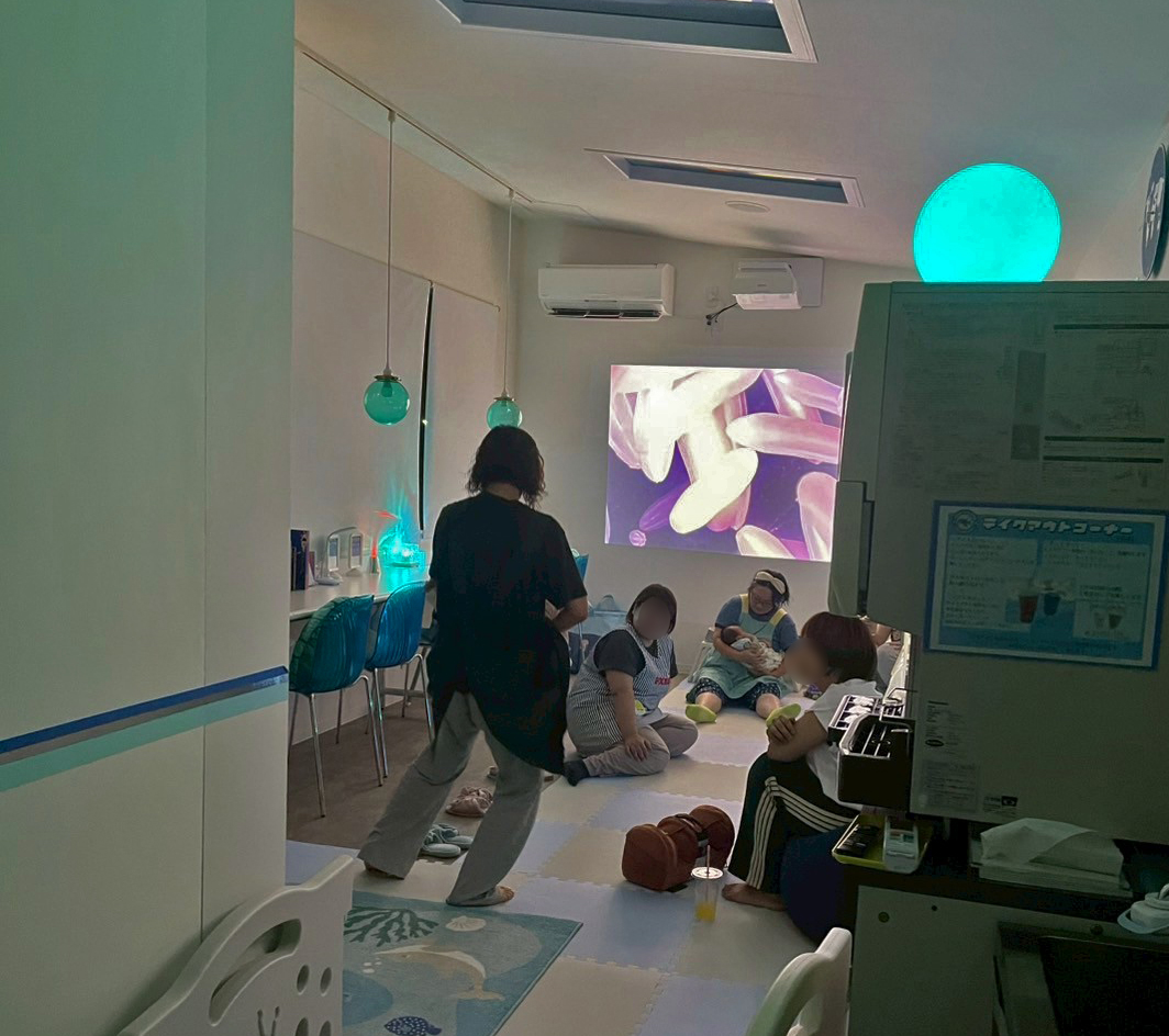 照明・音響・空間設計を、まるで海中や夜の水族館にいるような環境に整え、母親が心身ともに緊張を緩められるよう設計しています。単なるカフェ営業ではなく、「安心して滞在できる夜の居場所」として機能することを重視しています。